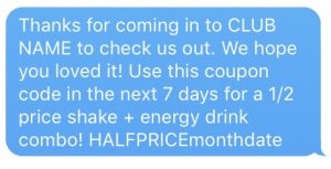 Day 1 Text for 1/2 price combo – SENT FROM CLUB PHONE: At the end of each day, you will send a text to each of the first-time customers that came into the club that day. You have their new customer forms with their info and will text them from your CLUB CELL PHONE. The text is an offer to come back in the next 7 days for a half-price combo. We know that if we can get them in 2-3 times in the first week or so, they will likely become regular customers. Use the code “HALFPRICE####” at end of the text. The The numbers used are the month and date of the expiration of the coupon which is 7 days from today.